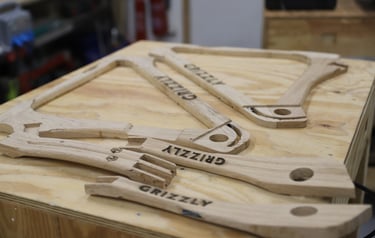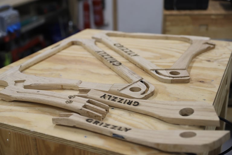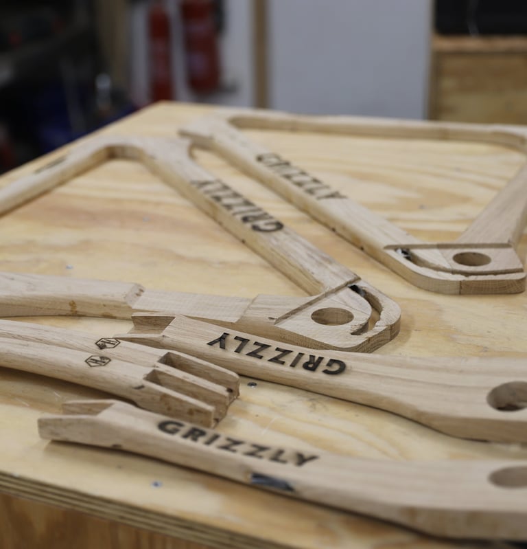 Tous les cadres sont fabriqués à Toulouse. Les matières premières sont sourcées localement : bois, pièces alu usinées, résine de collage structurelle.